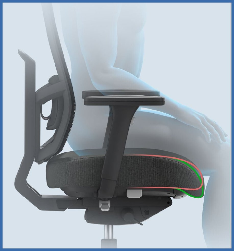 Työtuolissa on useita säätömahdollisuuksia, joiden avulla istuma-asento voidaan mukauttaa käyttäjän mittojen mukaan. Istuinkorkeuden säätö auttaa löytämään oikean työskentelykorkeuden työpöydän ääressä, ja säädettävä istuinsyvyys mahdollistaa hyvän tuen reisille eri pituisille käyttäjille. Tuolin synkroninen keinumekanismi liikuttaa selkänojaa ja istuinta samassa suhteessa, jolloin keho pääsee liikkumaan luonnollisesti työskentelyn aikana. Tämä auttaa vähentämään staattista kuormitusta ja tukee aktiivista istumista.